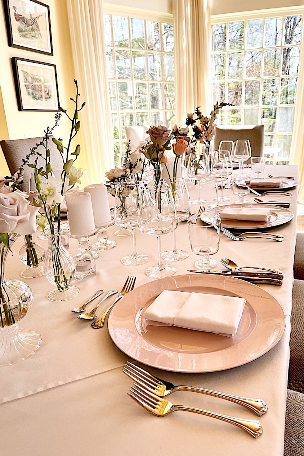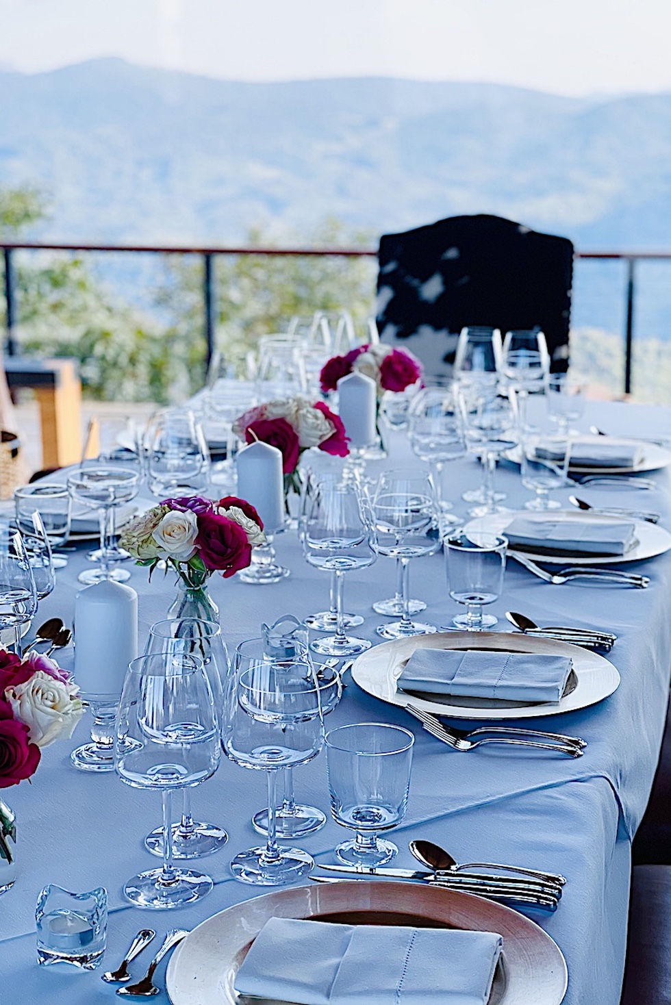 All catered events include table linens, napkins, china, silver flatware, stemware, glassware, flowers, candles along wih all food and French wine pairings.